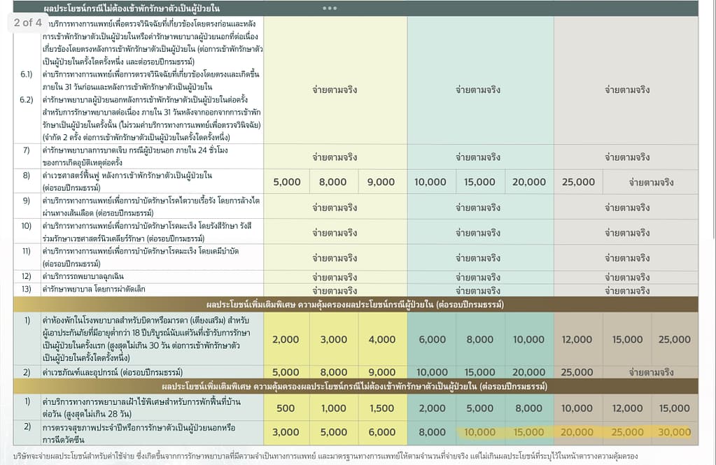 - วงเงินการรักษา 3 ล้านบาท ต่อปี และ เพิ่มเป็น 6 ล้านบาททันที หากเป็นโรคร้ายแรง 1 ใน 18 โรค ตามที่บริษัทกำหนด