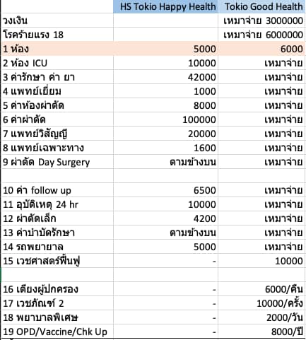 ตัวอย่าง ตารางเปรียบเทียบผลประโยชน์ ประกันสุขภาพโดเกียวมารีน แผน Tokio Happy Health ค่าห้อง 5000 vs Tokio Good Health ค่าห้อง 6000 เหมาจ่าย 3 ล้าน